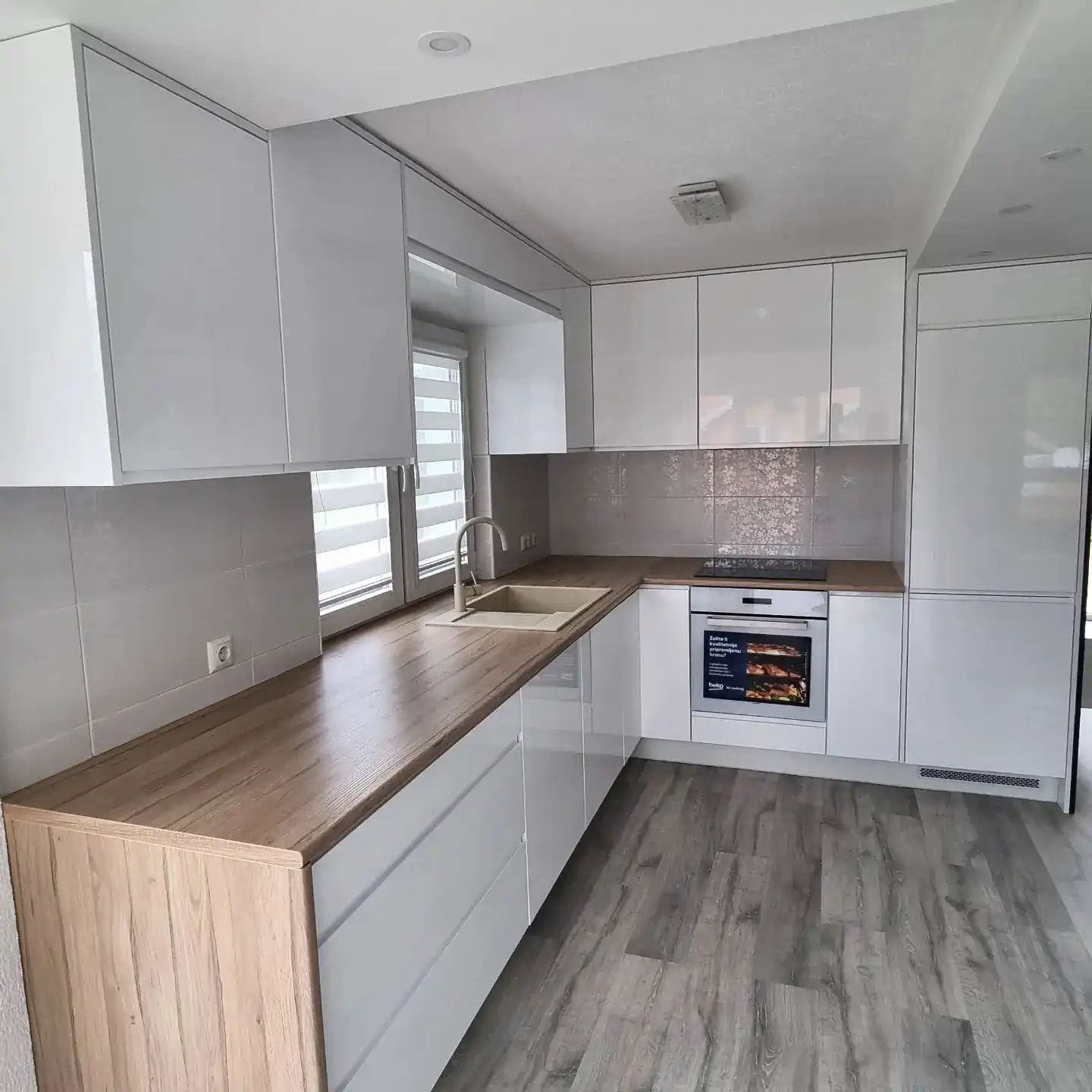 Elegantna kuhinja izrađena po mjeri, s kombinacijom drva i mat bijelih površina, dizajnirana za maksimalnu funkcionalnost i estetsku ravnotežu. Precizna izrada i kvalitetni materijali jamče dugotrajnost i jednostavno održavanje.